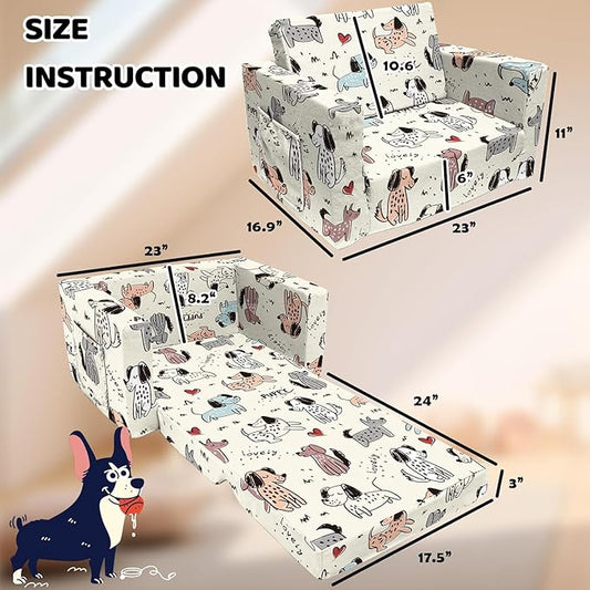 Kids Couch, 2-in-1 Convertible Sofa to Lounger, Comfy Flip-Out Couch Chair/Sleeper Bed for Toddler Boys and Girls (Beige-Dog)