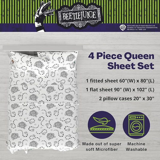 Franco Collectibles Beetlejuice Bedding Super Soft Microfiber Queen Sheet Set, College Dorm Essentials, (Officially Licensed Product)