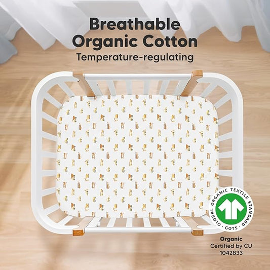 2-Pack Mini Crib Sheets Fitted, Pack and Play Sheets - Organic Cotton Pack N Play Sheets for Pack and Play Mattress, Playard Baby Crib Sheets, Jersey Crib Sheets Neutral for Boys,Girls (Nibbles/Bruce)