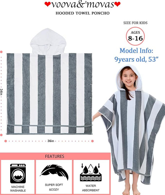 VOOVA & MOVAS Hooded Beach Towels for Boys| Girls | Teens (8-16Years), 100% Cotton Thick Poncho Towel Robe for Kids, Perfect for Pool, Beach, Bath and Gifts, Grey Cabana Stripe Design