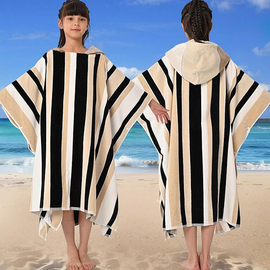VOOVA & MOVAS Hooded Beach Towels for Teens (8-16Years), 100% Cotton Thick Poncho Towel for Big Kids, Perfect for Pool, Beach, Bath, Brown Black Stripe