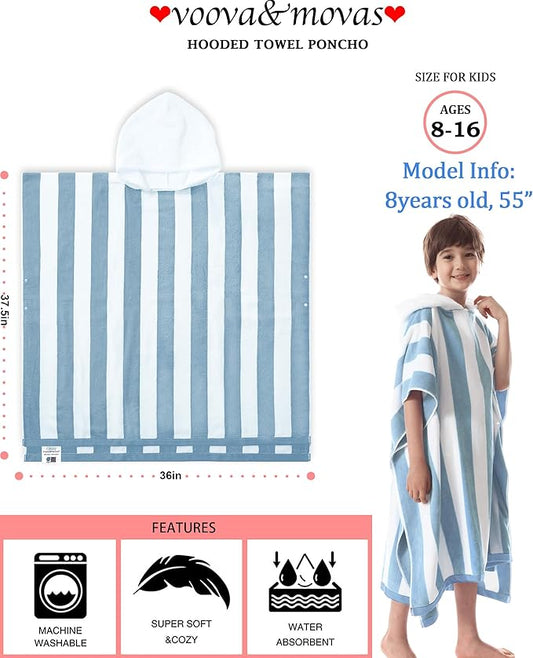 VOOVA & MOVAS Teens Poncho Towel with Hood (8-16Years), 100% Cotton Thick Poncho Towel Robe for Teens, Perfect for Pool, Beach, Bath and Gifts,Blue Stripe