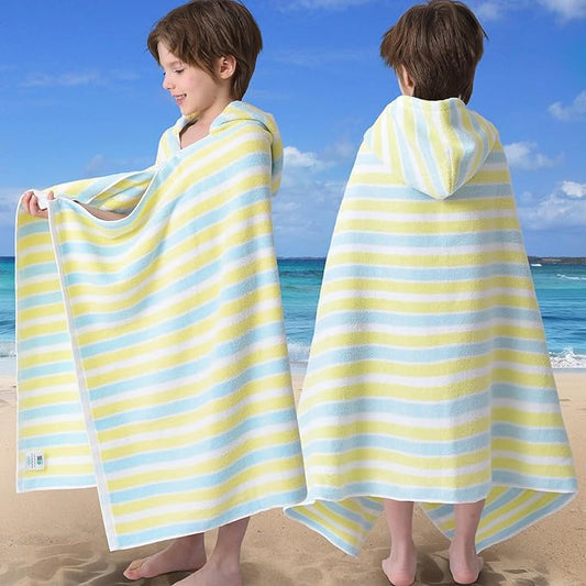 VOOVA & MOVAS Kids Beach Towels with Hood Lightweight - 100% Cotton (3-10Years) - Quick Dry Absorbent Towel for Pool | Swim | Beach | Bath, Boys Wrap Towel with Hood, Yellow Blue Stripe