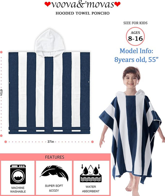 VOOVA & MOVAS Hooded Towel Poncho for Boys| Girls | Teens (8-16Years), 100% Cotton Thick Poncho Towel Robe for Kids, Perfect for Pool, Beach, Bath and Gifts, Navy White Stripe