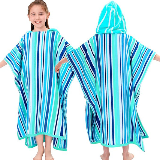 VOOVA & MOVAS Teens Hooded Poncho Towels (8-16Years), 100% Cotton Thick Poncho Towel Robe for Kids, Perfect for Pool, Beach, Bath and Gifts,Blue Green Stripe
