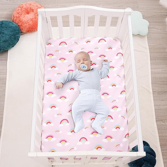 3 Pack Mini Crib Sheets, Premium Pack N Play Sheets for Boys Girls Neutral, Soft Breathable Baby Sheets Fit Pack N Play, Playard and Mini Crib Mattresses, Rainbow