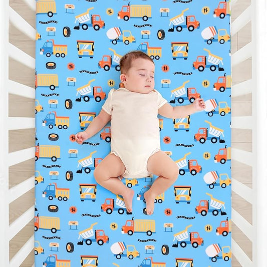 JISEN Baby Crib Sheets Soft Breathable Fitted Crib Sheets Baby Sheet for Standard Crib and Toddler Mattress Baby Bed Sheets for Crib for Baby Boys Girls Neutral 52x28 Inch Blue Trucks