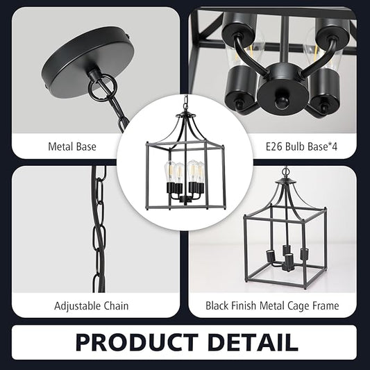 4-Light Black Chandelier Light Fixture, Modern Farmhouse Pendant Lights Kitchen Island, Industrial Iron Lantern Cage Chandelier Ceiling Hanging Lights for Kitchen Dining Room Entryway, E26 Socket