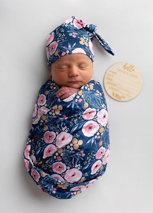 Baby Receiving Blanket Swaddle Blanket Newborn Wrap Swaddle Headband Set -Bloom Flower Pattern