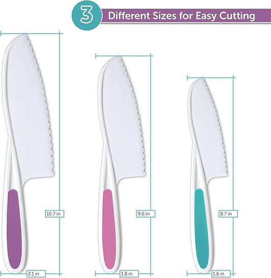 Toddler Knife Set of 3 - Firm Grip, Serrated Edges & Safe – Colorful Nylon Toddler Cooking Knives to Cut Fruits, Salad, Cake, Lettuce (Multi)