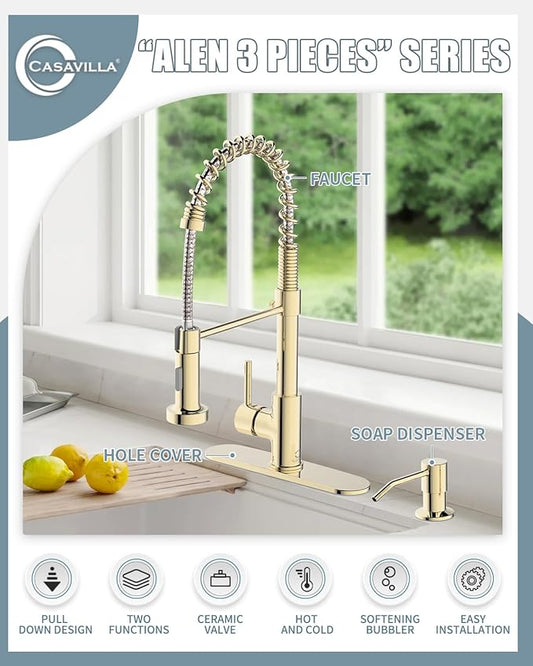 Gold Kitchen Faucet, Kitchen Faucet with Soap Dispenser, Pull Down Kitchen Faucet with Sprayer, Single Handle Kitchen Sink Faucet with Dual Function Spray Head, Camper Laundry RV Faucet,PVD