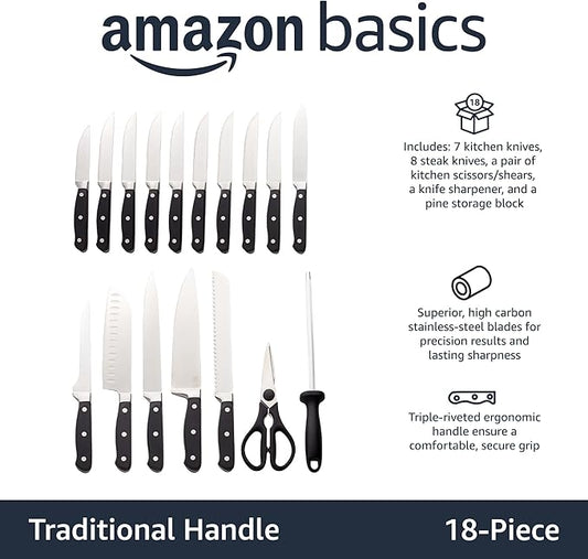 Amazon Basics 18-Piece Premium Kitchen High-Carbon Stainless Steel Blades with Pine Wood Knife Block Set, Black