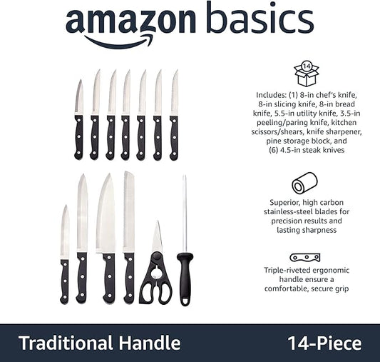 Amazon Basics 14-Piece Kitchen Knife Set with High-Carbon Stainless-Steel Blades and Pine Wood Block, Black