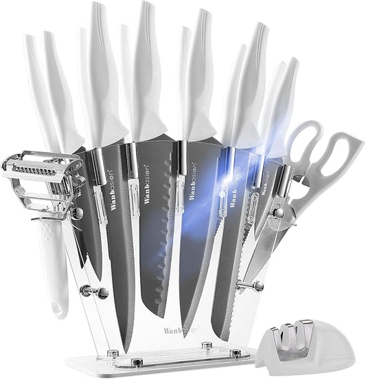 Wanbasion 16pcs White Kitchen Knife Set with Block, Stainless Steel Knives Set for Kitchen, Professional Chef Knife Sets for Kitchen with Sharpener Acrylic Block