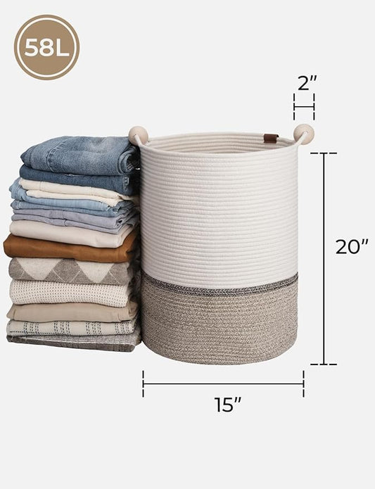 StorageWorks 58L Cotton Rope Laundry Basket with Wooden Beads Handles, Woven Basket for Storage, Dirty Clothes, Kids Toys, Towels, White & Light Brown