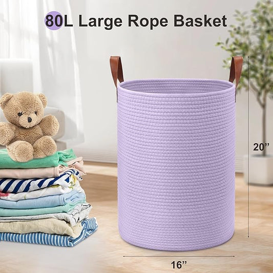 80L Large Rope Basket, Woven Rope Storage Basket with Leather Handles, Dog Toy Storage Basket, Bedroom, Nursery Blanket Storage, Bathroom Laundry Basket, 16“x20” Tall Rope Basket (Purple)