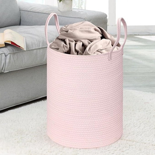 Baby Laundry Basket Hamper,Woven Cotton Rope Pink Laundry Basket Nursery Hamper Bin Storage Basket for Girls Kids Living Room Bedroom Cute Boho Tall Woven Rope baskets for Clothes Blanket Toys Large