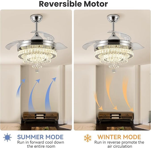 LEONTYNE 42" Modern Fandeliers Chandelier Ceiling Fan LED Dimmable Crystal Ceiling Fan with Light and Remote 6 Speed 3 Blades Retractable Fans for Bedroom Living Dining Room (APP & Timing)