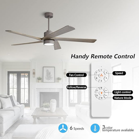 WINGBO 64" DC Ceiling Fan with Lights and Remote Control, 5 Carved Wood Blades, 6-Speed Reversible DC Motor, Modern Ceiling Fan for Bedroom Living Room Kitchen, ETL Listed