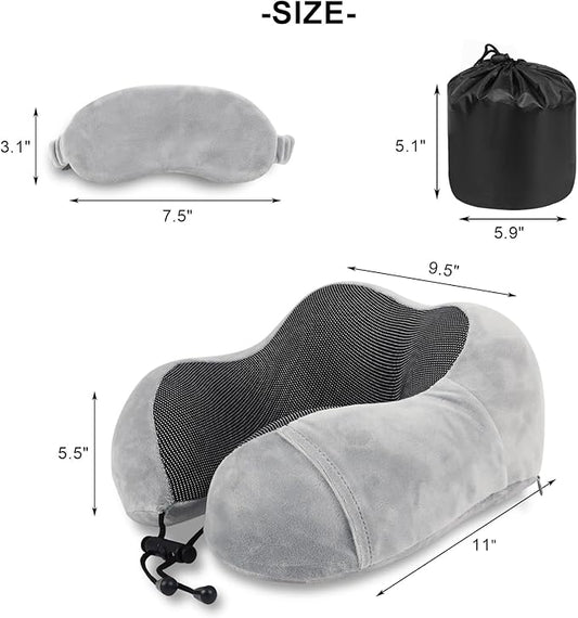 Pure Memory Foam Travel Pillow Set for Adults - Comfortable & Breathable Removable Cover, Airplane Travel Kit with Eye Mask & Portable Storage Bags for Plane Accessories - Grey