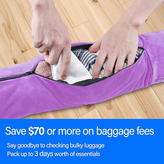 Travel Pillow You Stuff with Clothes, Stuffable Travel Pillow Transforms Into Extra Luggage Without Excess Fees, Stuffable Neck Pillow No Filler Fits 3+ Days of Travel Essentials Purple