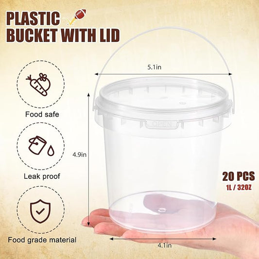PerKoop 20 Pcs 32 oz Soccer Ice Cream Buckets with Lids and Handles Clear Cocktail Rum Buckets for Drinks with 200 Soccer Stickers Plastic Transparent Tub Reusable Food Storage Containers for Parties