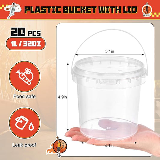 PerKoop 20 Pcs 32 oz Basketball Ice Cream Buckets with Lids and Handles Clear Cocktail Rum Buckets for Drinks with 200 Stickers Plastic Transparent Tub Reusable Food Storage Containers for Parties