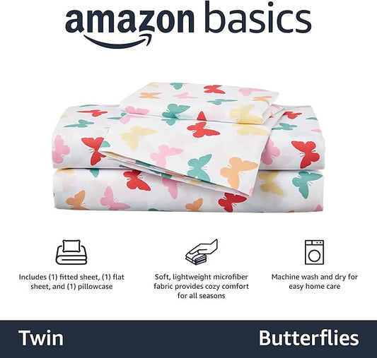 Amazon Basics Kid's Butterfly Friends Soft Easy-Wash Microfiber 3-Piece Sheet Set, Twin, Multi-Color Butterflies, Printed