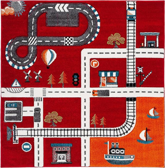 SAFAVIEH Carousel Kids Collection Area Rug - 5'3" Square, Red & Ivory, Non-Shedding & Easy Care, Ideal for High Traffic Areas for Boys & Girls in Playroom, Nursery, Bedroom (CRK192Q)