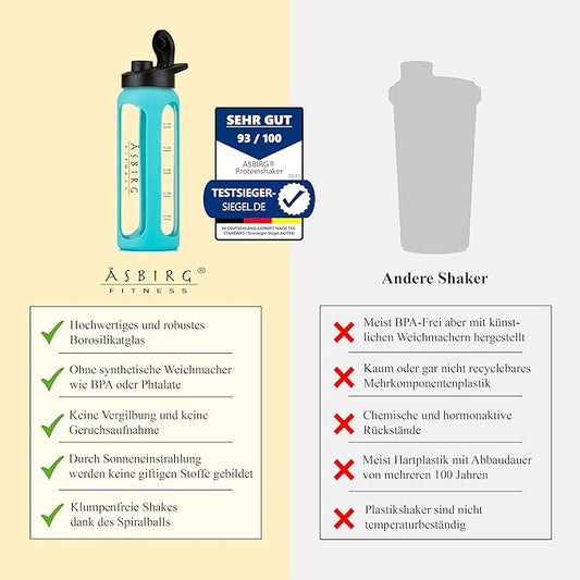 Fitness | Glass Protein Shaker | Protein Shaker | Drinking Bottle | with Spiral Ball - Aqua