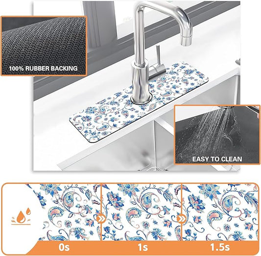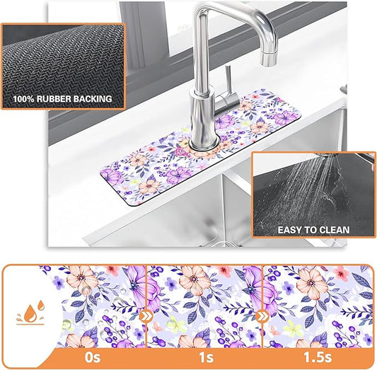 Kitchen Faucet Mat Artistic Floral Kitchen Sink Splash Guard Faucet Mat,1 PC Splash Guard Behind Faucet Drip Catcher for Kitchen,Sink Mat,Dish Drying Mat,Bathroom Faucet Mat 15.5""X5.5""