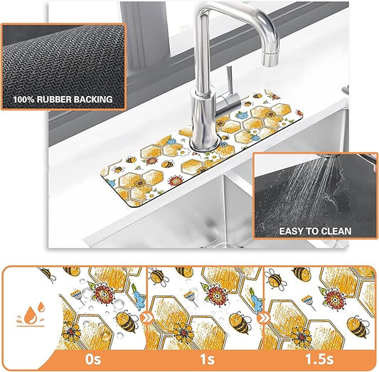 Kitchen Sink Splash Guard Faucet Mat Cute Bees and Honeycomb Sink Splash Guard Behind Faucet,1 PC Soft Diatom Mud Non-Slip Mat-for Kitchen,Dish Drying Mat,Bathroom Faucet Mat 23.5""X5.5""