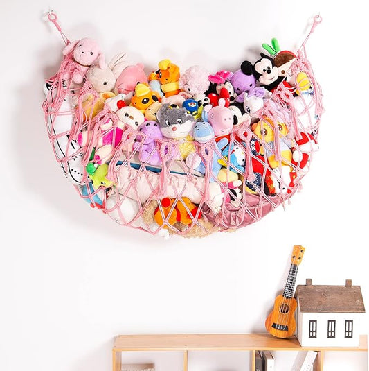 Stuffed Animal Net or Hammock Wall Hanging Net for Stuffed Animal Storage Macrame Toy Display Plush Toy Holder Soft Toy organizer for Nurery Baby Bedroom Playroom-Pink