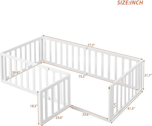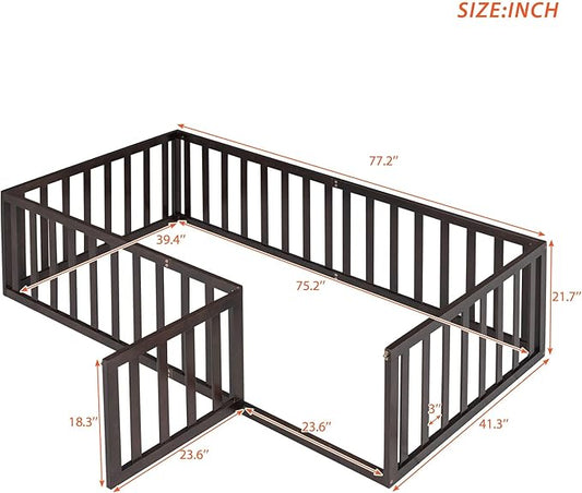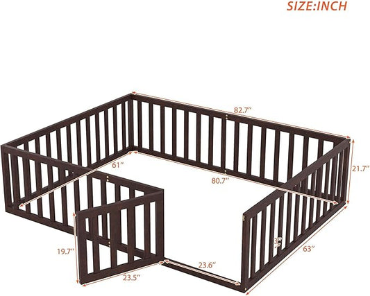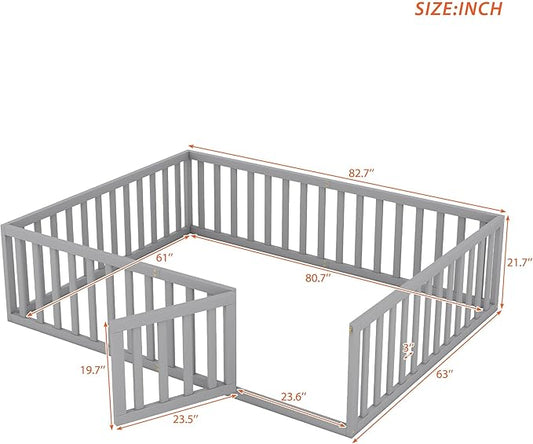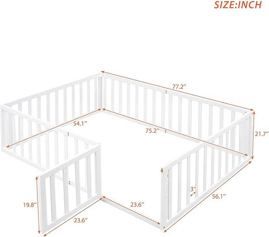 Queen Size Floor Bedframe with Door and Safety Guardrails Fence, Solid Wooden Toddler Montessori Platform Bed for Children Bedroom, Boys Girls, Kids Playroom