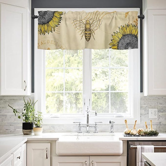 Vintage Sunflower Bee Valance Curtains for Kitchen Window,Summer Rod Pocket Valances Window Treatments Yellow Short Curtains for Bedroom/Living Room,54" X 18" -1 Panel,