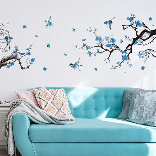 Zonon Flowers Wall Decals Vinyl Dragonflies Flowers Wall Stickers Removable Floral Wall Murals Peel and Stick Colorful Flower Wall Decor for Bedroom Living Room Nursery(Blue Flower)