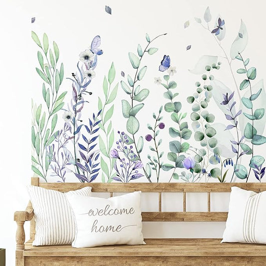 Zonon Flowers Wall Decals Vinyl Dragonflies Flowers Wall Stickers Removable Floral Wall Murals Peel and Stick Colorful Flower Wall Decor for Bedroom Living Room Nursery(Greenery)