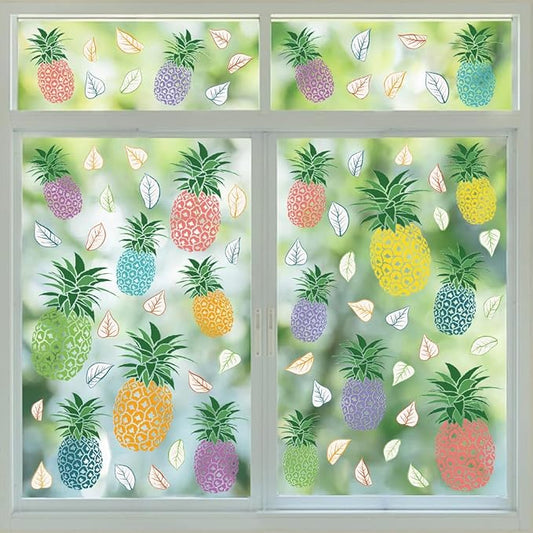 Watercolor Pineapple Window Stickers Cute Fruit Pineapple Plant Leaf Window Stickers Kitchen Kids Bedroom Living Room Dining Room Self-Adhesive PVC Removable Home Decor Wall Stickers Wallpaper