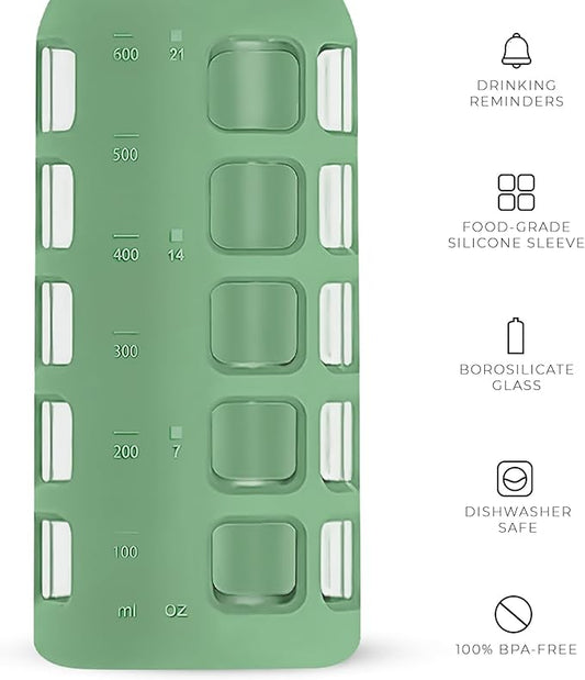 purifyou Premium 40/32 / 22/12 oz Glass Water Bottles with Volume & Times to Drink, Silicone Sleeve & Stainless Steel Lid Insert, Reusable Bottle for Fridge Water, Milk, Juice (22oz Shale Green)