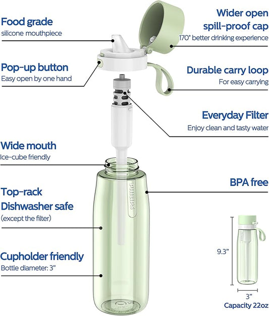 PHILIPS Filtered Water Bottle 22 Oz/36 Oz with Philips GoZero Everyday Water Filter, BPA-Free Tritan Plastic, Purify Tap Water Into Healthy Drinking Tasting Water