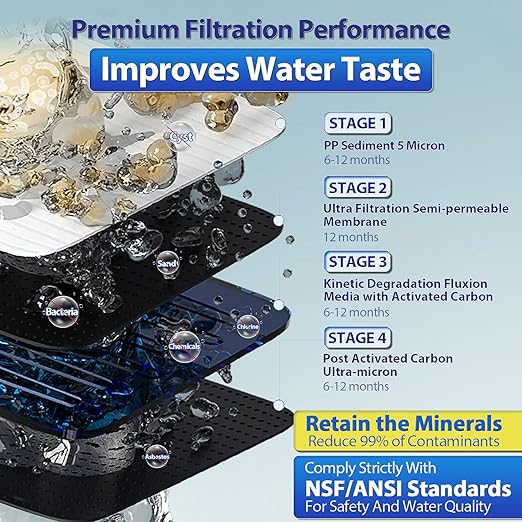 - SUPERIOR PERFORMANCE: The advance 4-stage design, which includes both Ultrafiltration and KDF/GAC stages, removes up to 99% of chlorine and chlorine treatment by-products, lead, and much more, while retaining minerals. Noted: This system is NOT a Reverse Osmosis water filtration system and does NOT lower TDS.