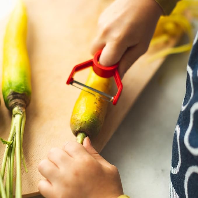 - PEELER: Rounding out Le Petit Chef set is the single finger-pulled peeler, perfect for peeling veggies, fruits, and other prep work. With single handed control, helpers keep their fingers safe and learn proper technique