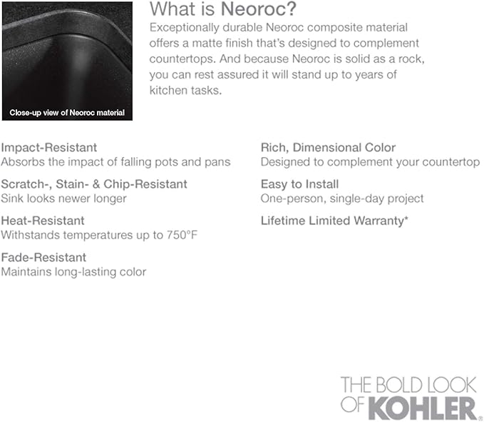 - Additional Hardware for Neoroc Kitchen Sink Use: K-8801 Sink Drain and Strainer With Tailpiece, K-8799 Sink Drain and Strainer Basket, K-23726 Drain Treatment, and K-23730 Neoroc Cleaner