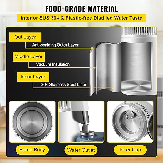 - 【Fast Heat Dissipation】Our countertop water distiller upgraded to aluminum fan blades, More Durable and improve heat dissipation. The exhaust cap is also upgraded from plastic to 304 stainless steel, ensuring premuim quality