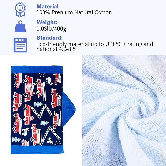 - 【Premium Material 100% Cotton 】Wowelife bath towel is made of 100% cotton, the quick dry beach towel is soft and breathable. Children with delicate skin can also be used with complete confidence. High quality fabric increases the durability of the toddler bath towel. Fade-resistant & no lint, eco-friendly material of UPF50+ rating and national 4.0-8.5 standard.