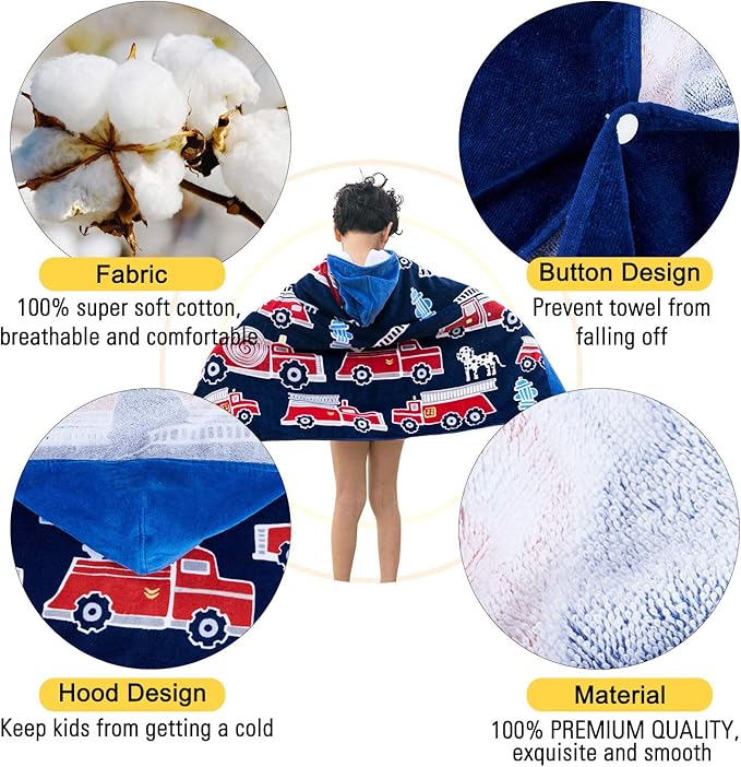 - 【Design & Theme】With buttons on front of the soft bath towel, adjustable and more convenient for kids to put on and off. Hooded design on beach towel to prevent children from catching cold. Fun themed designs and vibrant colors add even more fun for kids at the beach and in the bath.