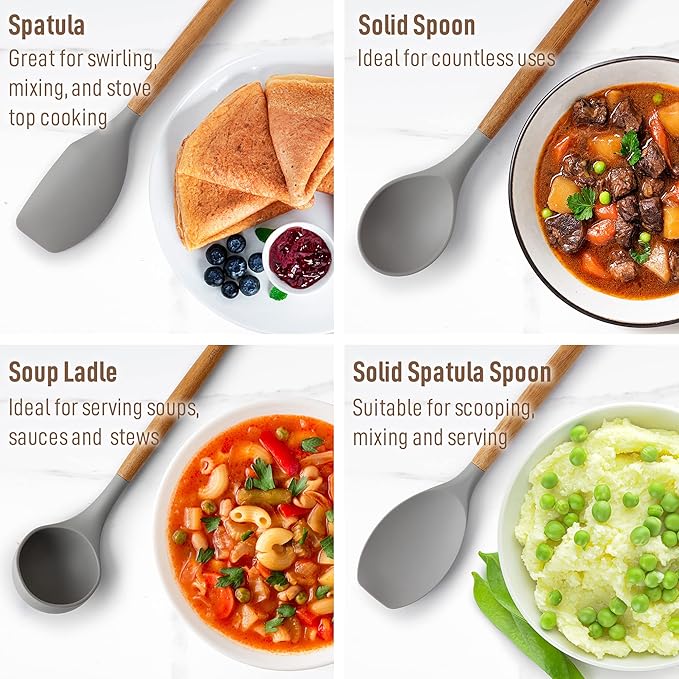 - Perfect For Your Non-stick Pots And Pans: Protect your precious cookware by using these silicone cooking utensil set designed with soft, non-scratch silicone to prevent scratching pots and pans when cooking. Engineered for the right mix between the flexibility of silicone and the stability of wood, making it sturdy, functional, and comfortable to use. Includes a solid spoon, slotted spoon, slotted spatula, solid spatula spoon, solid spatula, solid turner, pasta server, and ladle.