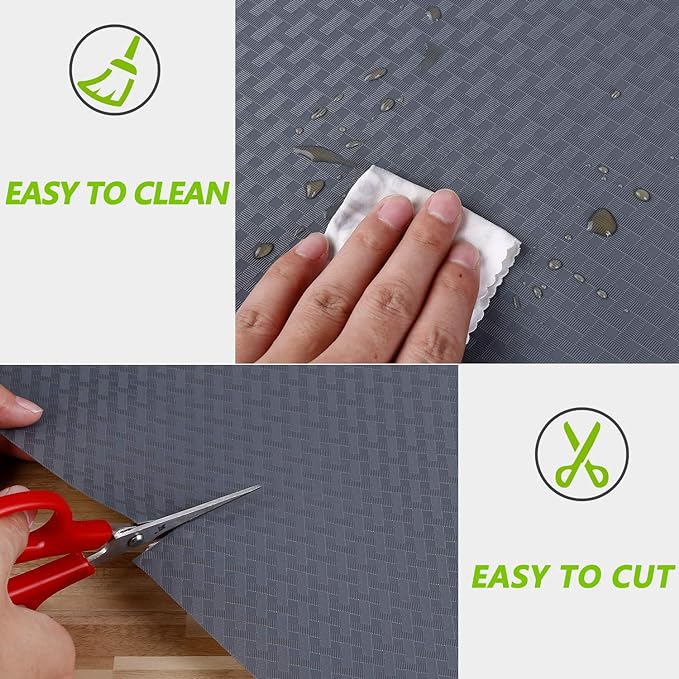 - EASY TO CLEAN AND CUT: Kitchen cabinet drawer mats is washable and waterproof. When the kitchen shelf liner is stained with oil or other dirt, you can easily wipe the dirt with mild soap or a damp cloth and fast to dry. And the cupboard liner has the most popular pre-cut sizes that you can easily cut any shape you want with a scissor or a knife.