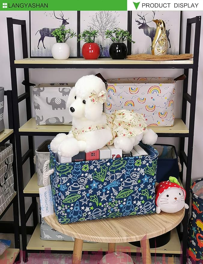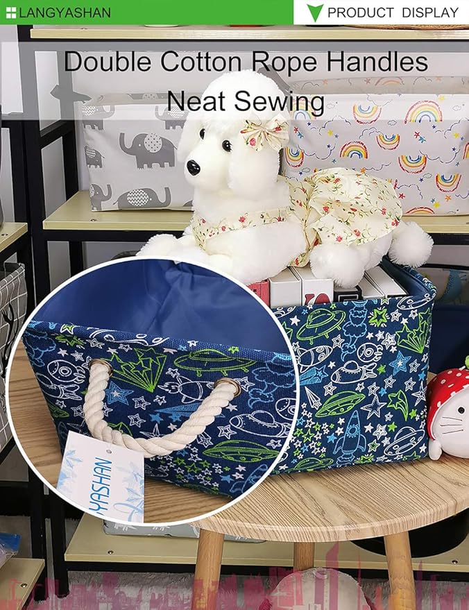 LANGYASHAN Rectangular Storage Bin Collapse Canvas Fabric Cartoon Storage Basket with Handles for Organizing Home Kitchen Boys and Girls Toys Office Closet Shelf Baskets (Full Spaceship)