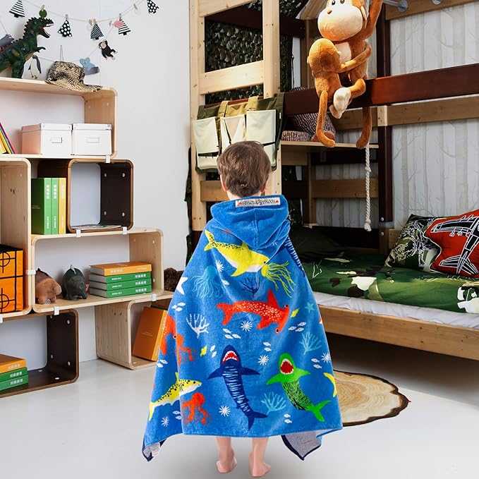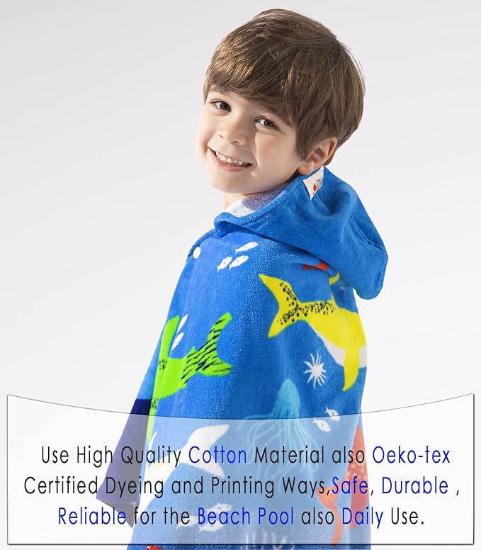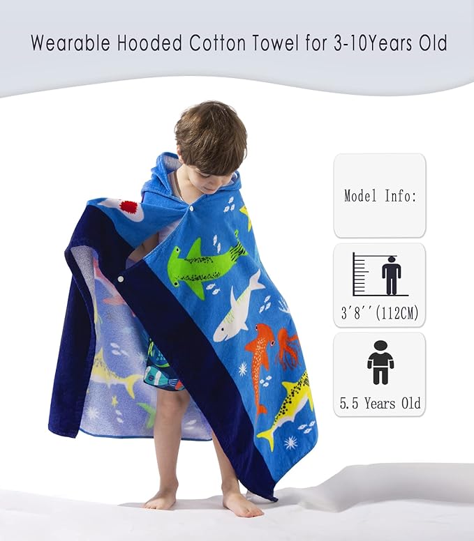 - SHARK OCEAN BEACH TOWELS : This Hooded COTTON towel wraps adopts an environmentally friendly Printing, the fishes sharks make kids towel so gorgeous and attractive that can get children’s love at once! The bright color shark pattern absolutely lovely and make your littles stands out from bath beach or pool